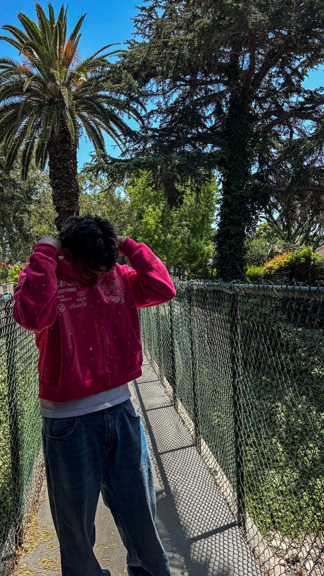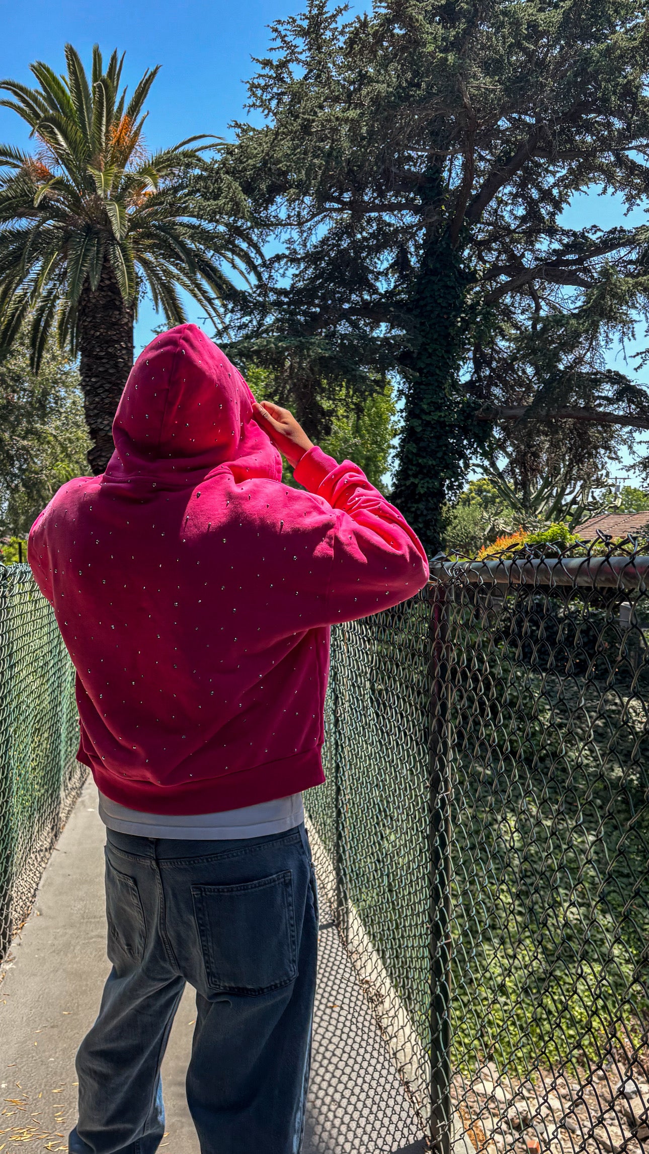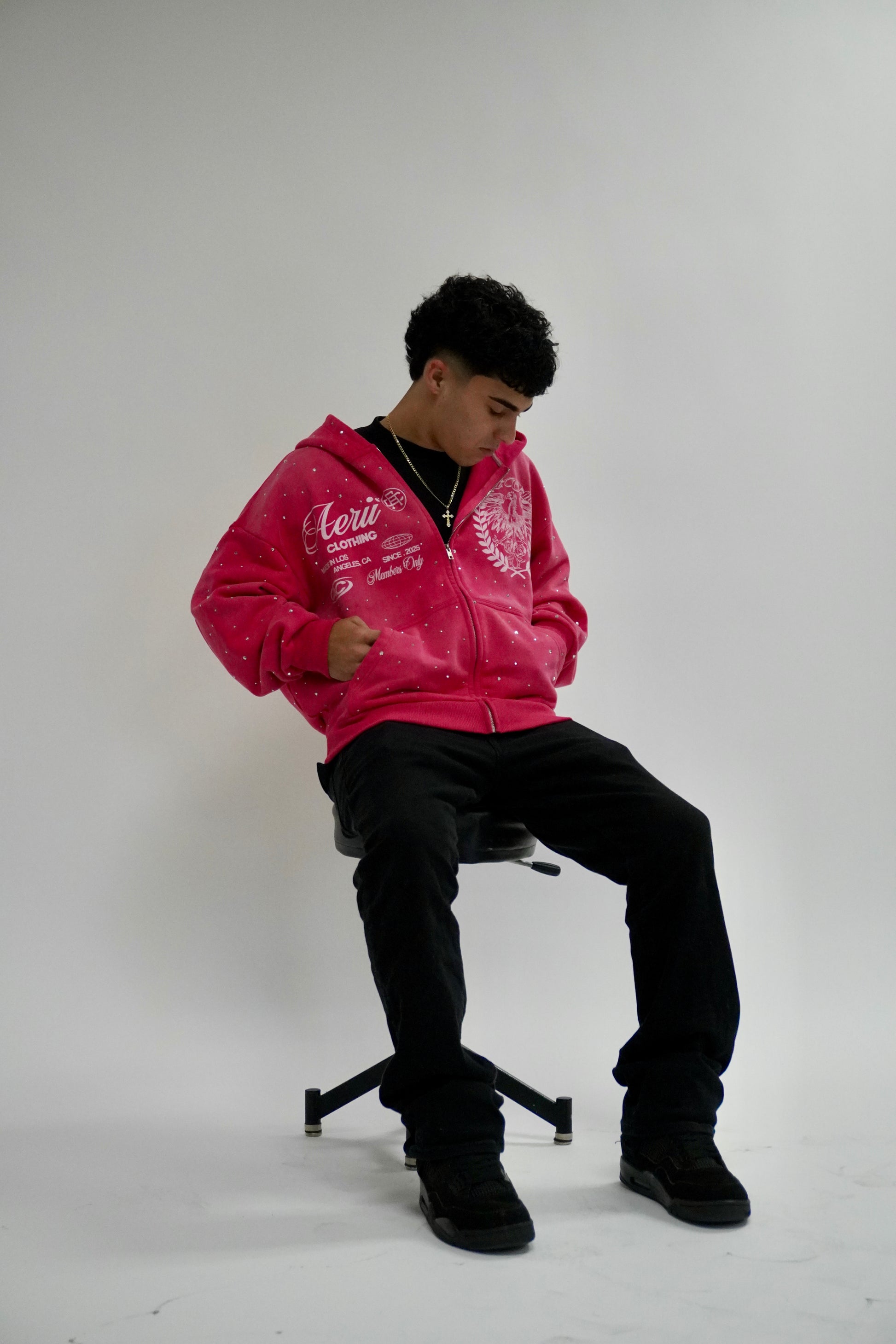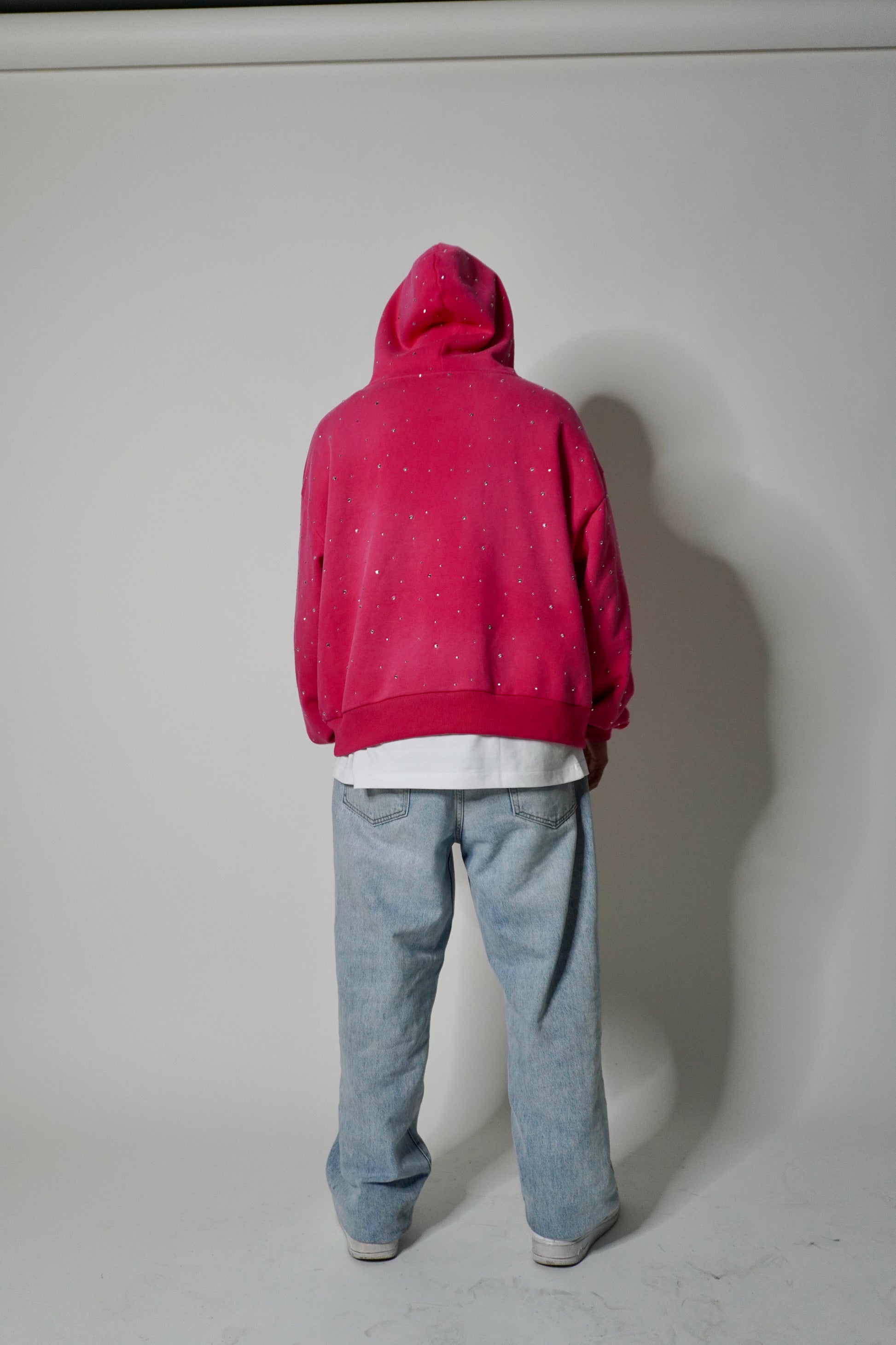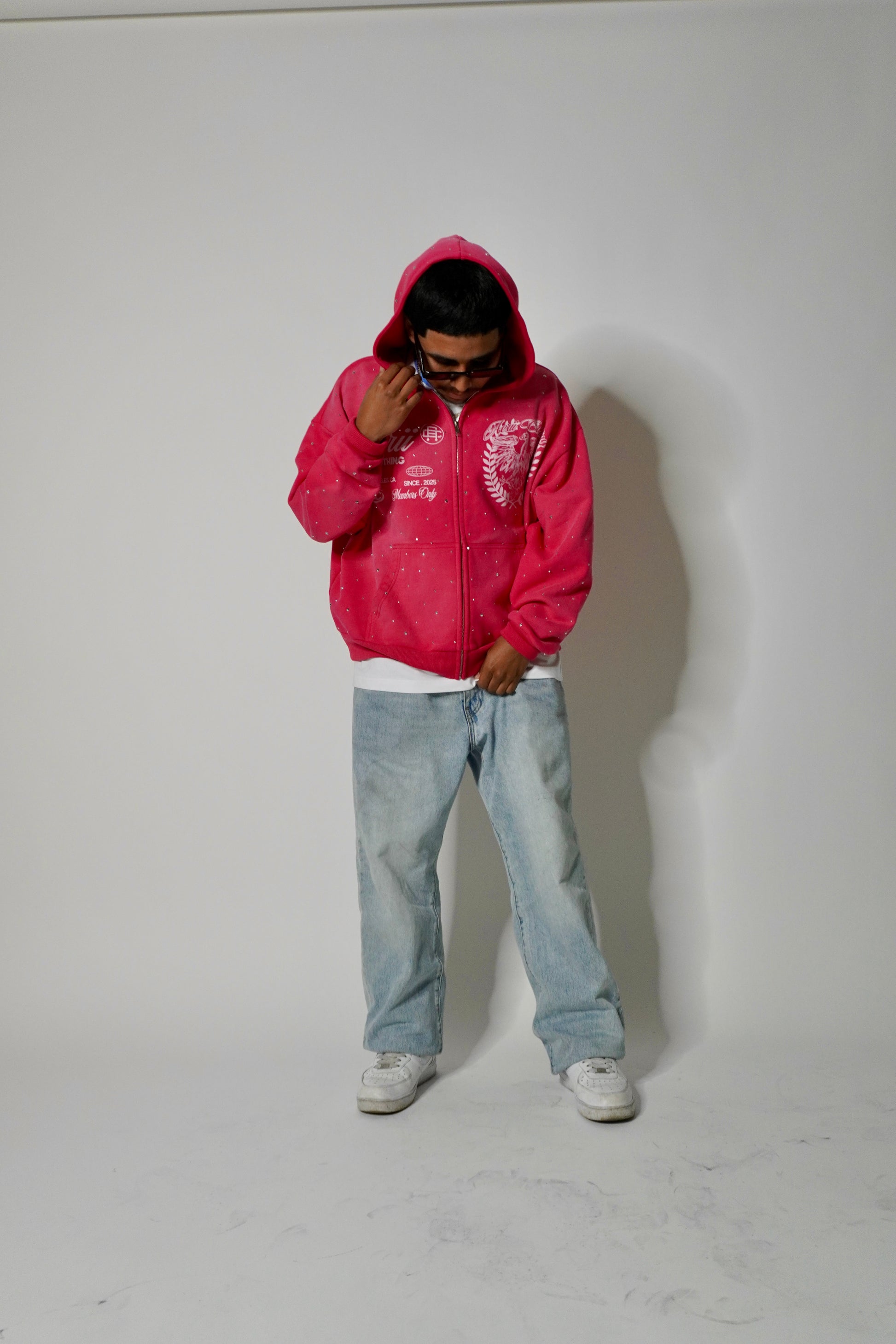 This is a 420 gsm zip up with dtg printing with rine stones all around